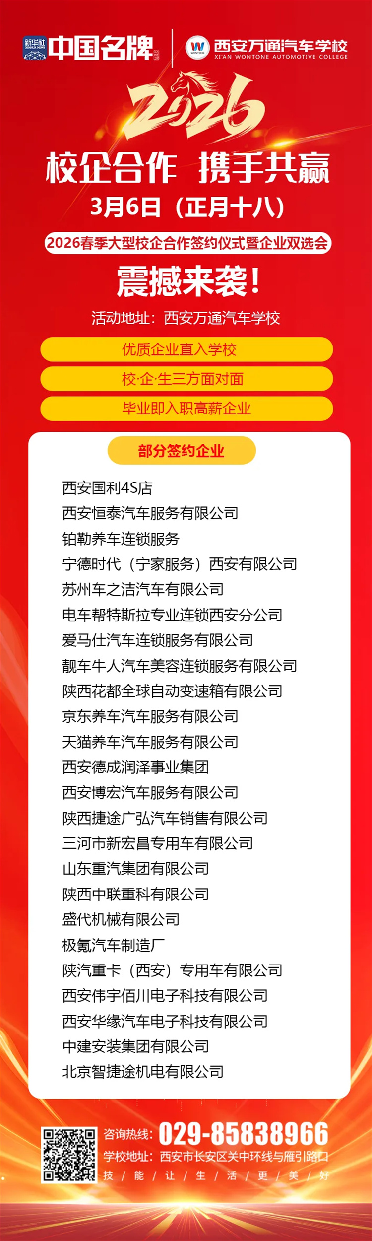 本次盛会以校企合作携手共赢为主题,汇聚汽车技术、焊接工程、智能制造三大领域的近百家家行业标杆企业。西安国利4S店、宁德时代宁家服务西安有限公司、京东养车、天猫养车、陕汽重卡、中联重科、中建安装集团等知名企业代表将亲临现场,与学校签订校企合作协议,并参与人才双选。企业名单中既有深耕行业多年的实力品牌,也有代表新兴技术方向的创新力量,充分彰显了西安万通校企合作平台的广度与深度。
